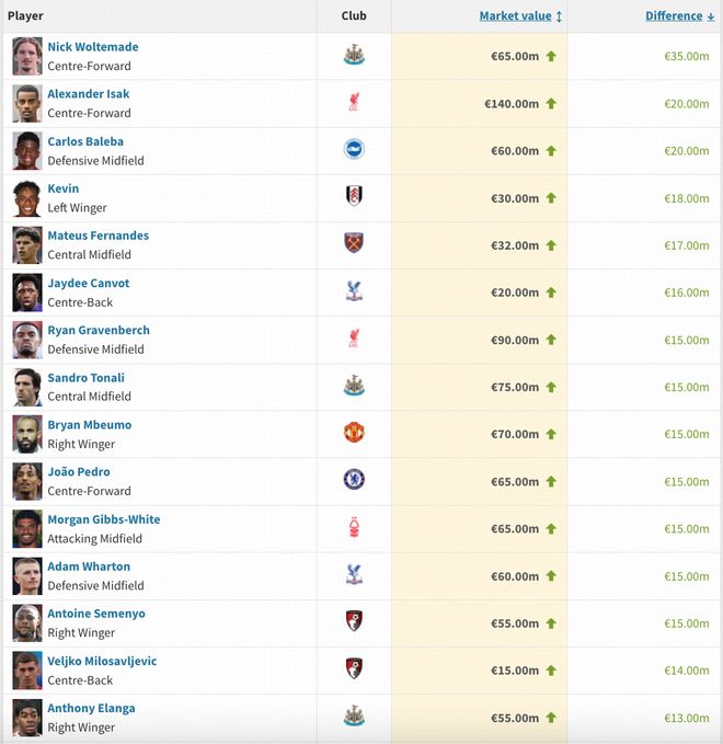 英超身价涨幅榜:沃尔特马德狂飙3500万欧,伊萨克上涨2000万欧